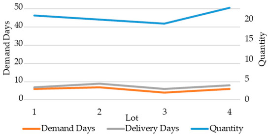 The analysis in terms of demand and delivery schedule data for product A is illustrated in Figure 7. It is shown that for lot 1, a quantity of 105 was supposed to be delivered on the 19th day, according to lead time starting from raising requisition (RP) but this was delayed until the 57th day due to work in process and clustered queues. Similarly, other respective lots also delayed accumulatively. Figure 7 explains the overall delays and variation in the data.