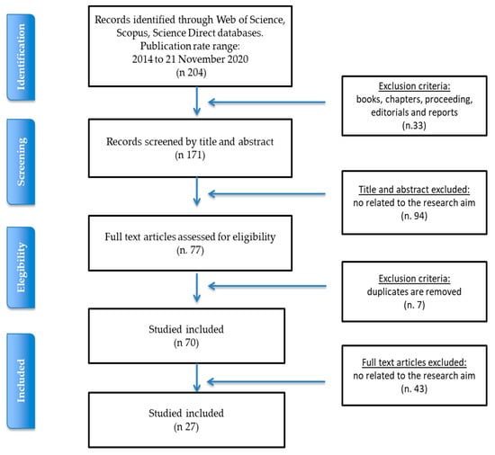The review of the literature was conducted to select studies from the academic literature and to summarize the main findings on the CE in agri-food systems. The review was performed following the Preferred Reporting Items for Systematic Review and Meta-Analysis (PRISMA) method [46]. Figure 1 shows a flowchart in which the selection criteria are identified in a systematic and replicable technique with the intention of identifying the papers that explored the topic of the CE in the agri-food sector [47,48,49]. Scopus, Web of Science, and Science Direct databases were used to search for relevant literature on the topic under investigation. The research was carried out in November 2020 and was restricted to the years post-2013, which was considered appropriate to identify recent trends in the field. The search for the articles ended on 21 November 2020.