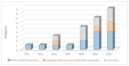 Regarding the type of article, the majority of the selected papers were reviews and commentary articles (n. 14), followed by case studies (n. 9) and consumer behavior and stakeholder preference analyses (n. 4). In detail, as shown in Figure 3, in 2014 and 2015, the selected papers were review and commentary papers; in 2016, the papers were a review and commentary (n. 1), consumer behavior and stakeholder analysis (n. 1), and a case study (n. 1); in 2017, the papers were reviews and commentaries (n. 3); in 2018, the papers were reviews and commentaries (n. 2) and a case study (n. 1); in 2019, the papers were review and commentary (n. 4), a consumer behavior and stakeholder analysis (n. 1), and case studies (n. 2); finally, in 2020, the papers were reviews and commentaries (n. 4), consumer behavior and stakeholder analyses (n. 2), and case studies (n. 3).