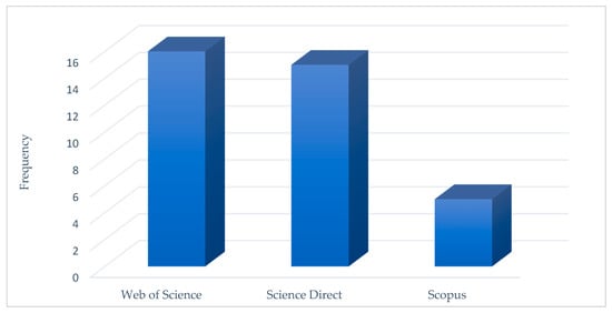 Concerning the databases from which the selected papers were obtained, as shown in Figure 4, the majority of selected papers were found in the Web of Science database (n. 16) and Science Direct (n. 15), and the rest in Scopus (n. 6). Several articles were identified in more than one database; therefore, the sum of the figures is greater than 27.