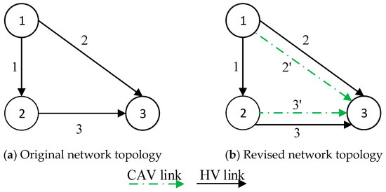Let denote a general urban transportation network, where represents the set of the nodes and indicates the set of links. Define as the CAV link sets of the network, and K as the sets of pairs including CAV links and HV links. For instance, Figure 1 shows a simple network to illustrate the process of CAV lanes implementation. The number on each edge represents the link number. Figure 1a shows the network without CAV links. After deploying CAV links, assuming that link 2 and link 3 are the candidate CAV links, thus, the updated network is Figure 1b, where and , and . To distinguish two types of vehicles, we defined to indicate the set of travel modes, where 1 represents the CAV mode and 2 represents the HV mode. Moreover, let denote the origin–destination (OD) pairs. Define as the travel demand of OD pairs for travel mode . Let represents the path set and denote the CAV path set.