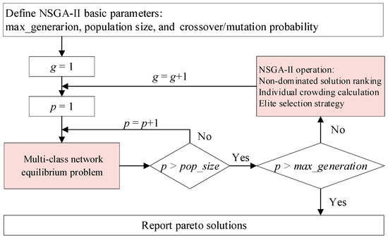In this section, two algorithms are introduced to solve the dedicated CAV lanes optimal implement problem. The upper-level model was to determine the optimal implementation scheme by minimizing the objective value, which is difficult to handle because it belongs to an NP (non-deterministic polynomial) hard problem. Heuristic algorithms are generally regarded as effective methods to solve NP hard problems. Hence, in this paper, the non-dominated sorting genetic algorithm II (NSGA-II) [44] was adopted to solve the upper-level model, which has multiple objectives. The low-level problem is the multi-class network equilibrium, which can be solved by the diagonalized Frank–Wolfe (DFW) algorithm [45]. Figure 2 draws the overall framework of the solution approach.