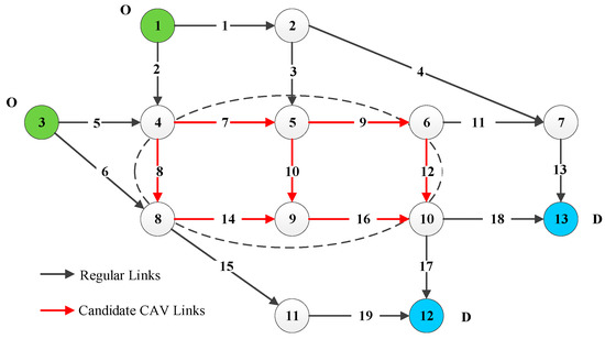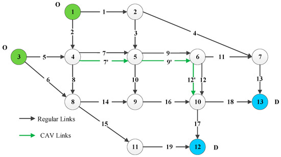 The proposed model and algorithm are first implemented in the Nguyen–Dupuis network (Figure 4), which consists of 13 nodes, 19 links, and four OD pairs. The total demand for OD pairs (1, 12), (1, 13), (3, 12), and (3, 13) is 8, 8, 6, and 6 (103 vehicles), respectively. The penetration rate of CAVs is assumed to be 50% and identical for all OD pairs. The parameters in travel time function parameters are , and . The detailed network attributes are listed in Table 1, including the length (), free-flow travel time (), and initial capacity (). Table 2 shows the detailed parameters and coefficients of three pollutants.