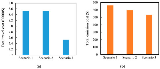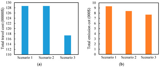 In the base scenario, we compared the three scenarios to investigate the benefit of implementing dedicated CAV lanes. The first scenario is the basic network without CAV lanes implementation and CAVs. The second scenario was the network with CAVs but without CAV lanes. The third scenario is the modified network with CAVs and CAV lanes implementation. Table 3 and Figure 5 show detailed results for the three scenarios. Given that there is more than one Pareto optimal solution, we take the mean of Pareto fronts as the optimal solution to make a comparison. From Table 3, we know that implementing CAV lanes in the road network cannot only reduce system travel time cost, but also reduce the vehicle emission cost. More specifically, compared to scenario 1, scenario 2 could reduce the total emission costs by 9.9%, which indicates the emergence of CAV benefits to reduce emission costs. Compared with scenarios 1 and 2, scenario 3 contributes to reducing the total travel time cost by 12.03%. Similarly, scenario 3 reduces the total emission cost by 19% and 10.42%, compared to scenarios 1 and 2, respectively. As a result, implementing dedicated CAV lanes could further decrease emission costs and improve traffic efficiency. The adoption of CAVs and implementing dedicated CAV lanes will be conducive to sustainable transportation development while ensuring travel efficiency.