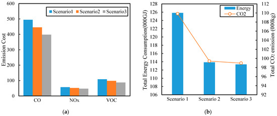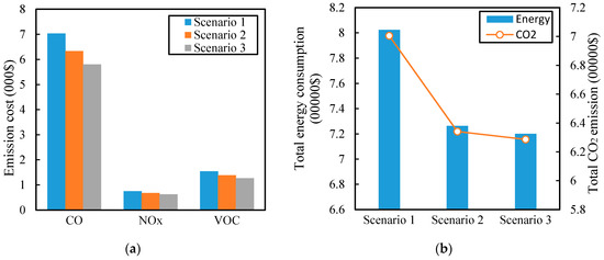 Figure 6a presents the changes of three pollutants in the three scenarios. Specifically, compared to scenario 1 and scenario 2, CO emissions decrease by 19.5% and 10.5%, respectively, in scenario 3. Similarly, NOx emissions would reduce by 17.5% and 7%; and the VOC emissions reduce by 19.4% and 10.3%. Obviously, implementing dedicated CAV lanes will reduce pollutant emissions, which is reasonable. An explanation is that the dedicated CAV lanes could promote traffic efficiency by increasing link capacity. On the other hand, advance connected autonomous driving and communication technologies of CAVs are beneficial to further reduce energy consumption. Figure 6b shows the result of energy consumption and CO2 emission for three scenarios. More specifically, the total energy consumption in scenario 3 decreases by 19.5% and 9.4% compared to scenarios 1 and 2. Similarly, total CO2 emissions could reduce by 0.4% and 9.5%. The results support that CAVs and the deployment of CAV lanes could reduce the energy consumption and CO2 emission. In other words, the adoption of CAVs will reduce the negative effects of road transportation on the environment.