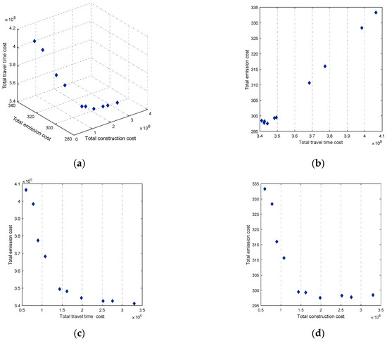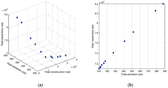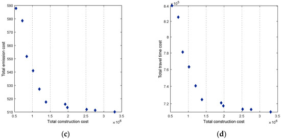 Figure 7 presents the Pareto front of the dedicated CAV lanes implementation schemes and the relationship between the two objectives in the Nguyen–Dupuis network. The result shows that there are evident trade-offs between minimizing the emission cost and CAV lanes construction cost, as well as the minimizations of the travel cost and construction cost. In contrast, emission cost and construction cost show consistent trends to some extent. Moreover, many potential benefits can be obtained from implementing dedicated CAV lanes, which will greatly reduce the total travel time and emission before the construction cost up to 2 × 106 $. After this value, when the construction cost varies from 2 × 106 $ to 3.5 × 106 $, the total travel time cost and emission cost are relatively stable. The benefits from CAV lanes implementation for network performance are very weak.