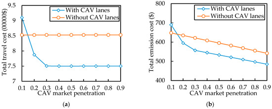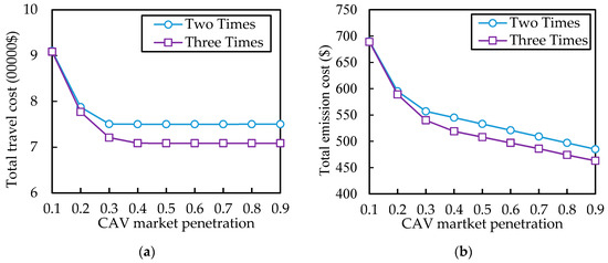 Effect of CAV market penetration on the total travel cost (a) and total emission cost (b).