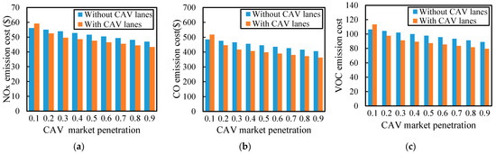 Effect of CAV market penetration on three pollutants in two scenarios: NOx emission cost (a); CO emission cost (b); and VOC emission cost (c).