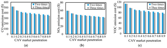 Figure 11 denotes the effect of CAV lane capacity on the total travel cost and total emission cost considering two situations, i.e., the capacity of a CAV lane is two and three times the capacity of a regular lane. As shown in Figure 11a, a larger capacity for dedicated CAV lanes will reduce the system’s total travel cost. This conclusion can also be confirmed by the Pareto relationship between the total travel cost and CAV construction cost as shown in Figure 7d. Figure 11b further affirms that greater CAV lane capacity reduces the total emission cost. In addition, Figure 7d shows that a larger CAV market penetration decreases the total emission cost. Specifically, compared to the two-time capacity increase, the three-time capacity increase would reduce the total travel cost and total emission cost by 5.5% and 4.6%, respectively, when the CAV market penetration is 50%. Intuitively, Figure 12 reports the change of three pollutants (CO, NOx, and VOC) under the two CAV lane capacity situations.
