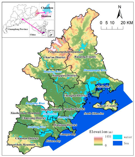 Chaozhou and Shantou are located in the east of the Guangdong Province (23°21′ N–24°14′ N, 116°14′ E–117°16′ E), where the coastline is facing the South China Sea (Figure 1). This region encompasses the unique, local Chao-Shan culture; people in this region share a similar lifestyle, the same cuisine, and the same Chao-Shan dialect. The total combined area of these two cities is 6632 km2 (including the sea territory), with a population of 8.32 million. Chaozhou is in the northeast of the EGD, while Shantou lays in the southwest. Chaozhou has three administrative regions at the county-level: Raoping County, Chao’an, and Xiangqiao Districts, while Shantou city has seven county-level regions, which are the districts of Jinping, Longhu, Haojiang, Chenghai, Chaoyang, Chaonan, and Nan’ao County. Even though the EGD is one of the most populous regions of the Guangdong Province, and many counties and towns are considered to be peri-urban areas, when comparing GDPs with the Pearl River Delta, it is apparent that EGD is the lesser developed area [70,71].