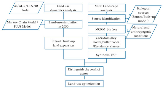 First, we used four indexes to analyze the land-use dynamics in EGD. Second, the methods of the land-use simulation process were demonstrated. The Markov chain model, which predicted the quantity of land-use types in 2030, was introduced. Then the detail of the FLUS model and the validation process were presented. Third, the concept and the process of establishing the MCR model were also presented. Finally, the ESP can be synthesized.