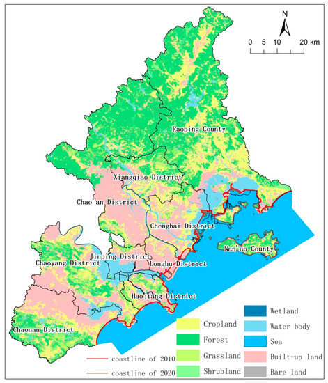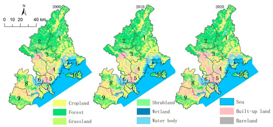 EGD land use in 2000, 2010, 2020. 1: Raoping County, 2: Chao’an District, 3: Xiangqiao District, 4: Chenghai District, 5: Longhu District, 6: Jinping District, 7: Haojiang District, 8: Chaoyang District, 9; Chaonan District, 10: Nan’ao County.