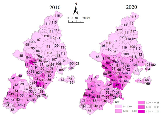 Township—level development intensity (DEN) of 2010 and 2020. Numbers on the map indicate the series number of the towns (see Supplementary Table S1).