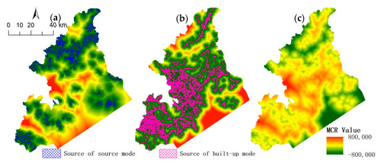 Minimal cumulative resistance model (MCRM) results of the source and the built-up modes, based on (a) sources of ecological surfaces, (b) built-up land, and (c) the results of (a,b).