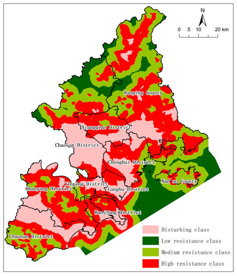 The disturbing layer accounted for ~21.13% of the total study area (1401.34 km2), located mainly around the Lianjiang River valley, the center of Shantou, southern and central Chao’an and Xiangqiao Districts, and a belt along the coastal sea (Figure 7). The low class accounted for ~10.67% of the study area (707.63 km2) and was mainly concentrated in the north and southwest, corresponding to the montane and pelagic regions of EGD. The medium class proportion was 28.82% (1911.34 km2), and located adjacent to the low class south of Chaonan District, central Chaoyang and Chao’an Districts, and northern Raoping County. The high class accounted for the greatest proportion of the EGD, 39.37% (2611.02 km2), and surrounded the disturbing layer. This phenomenon showed that the high class had a strong correlation with human activities, and any further expansion of built-up land would encroach the high-resistance areas first.