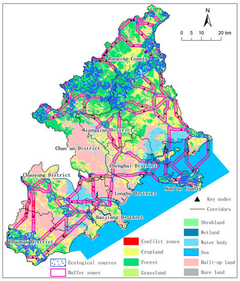 After identifying the ecological sources and setting up the resistance surface, it was necessary to connect them based on the MCRM surface analysis. The least-cost path method was applied to establish the corridors, and the corridors connect the ecological sources. In our study, the least cost path was calculated by the tool of linkagemapper (https://circuitscape.org/linkagemapper/ (14 January 2021)) in ESRI ArcGIS (v.10.2), and the linkagemapper is a commonly used tool in ecological and habitat studies [96,97]. A 40 km threshold was used to truncate corridors between sources, with a maximum number of connected nearest neighbors set to four after tested. Key nodes, which represent the place that had equal resistance values between every two ecological sources, were considered to be crucial to the process of maintenance and migration of species [48]. Moreover, the key nodes were identified through the watershed method toolbox in ArcGIS. Buffer zones of 600 m were set up around the center of each corridor. Conflict zones are the most sensitive and fragile regions in need of future protection. We simulated the increase in built-up land for 2030 using the FLUS model and labeled the intersection of areas where new built-up land occurred and buffer zones as conflict zones. The conflict zones are the concern for future land-use management.