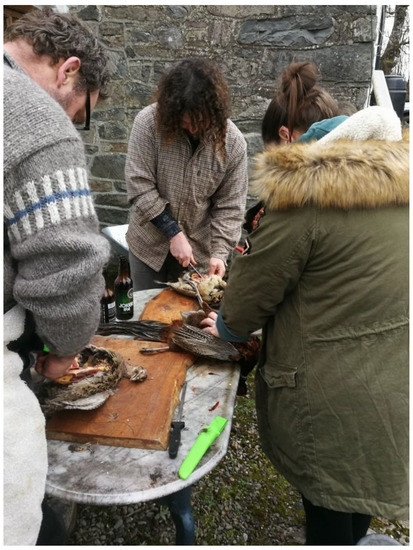 Many aspects of using roadkill as food are unclear—e.g., assessing its microbiological safety, ownership of the dead animals, etc. That is why this is done on a small scale and not as part of workshops for outsiders. Scotland’s Natural Larder (a Scottish Natural Heritage organisation) has made some training materials on handling game safely (http://scotlandsnaturallarder.co.uk/game/; accessed on 1 March 2021); however, there was political pressure not to publicly address the issue of roadkill, although this was discussed in conversation with Wilde (the second author).