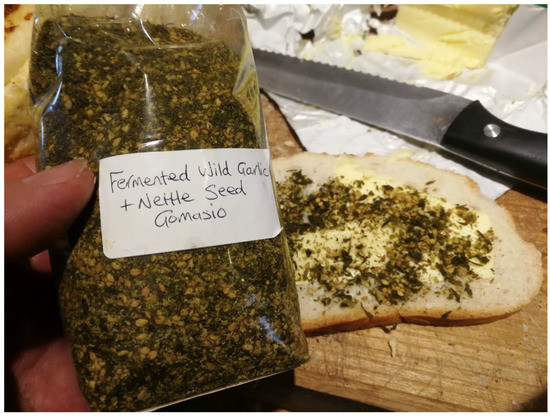 An example of “fusion” wild food used by British foragers—fermented wild garlic and nettle seed gomasio, served in the AoF meeting in Wales, 2020. Wild garlic (Allium ursinum) and nettles (Urtica dioica) are common native plants collected for generations, but in this case, they are used in a different context. The garlic is lactofermented (which is a completely forgotten technique in British cuisine). Nettle seeds are not the part of the plant that was traditionally used. The recipe itself is Japanese. Gomasio is a sesame salt; here, sesame was replaced by native ingredients. Photo by Łukasz Łuczaj.
