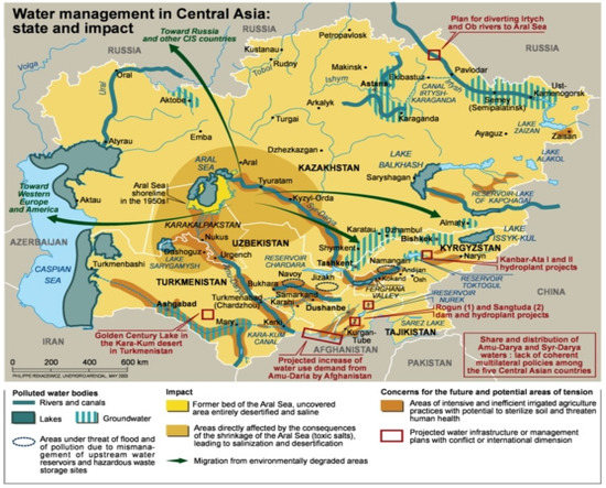 - Hogan, B. Water Management in Central Asia after 1991. Eurasianet.org, 5 April 2000. Available online: https://eurasianet.org/asianet-environment-5 (accessed on 13 July 2020).