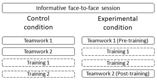 We carried out a randomized controlled trial with a pre–post design. This study included a between-subjects factor (training) and a within-subjects factor (time of measurement: pre–post intervention). The entire study took place through an online web-tool specifically designed for dispersed synchronous interaction among team members. This web-tool had a text chat with emoticons and a panel to broadcast video, instructions, and training, either individually or in groups. It also allowed participants to interact during the activities by answering the training exercises or doing the experimental tasks together.