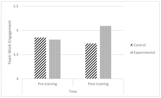 Hypothesis 1 proposed that affect management training would increase TWE levels in comparison with a control group. The results of the ANOVA reveal no global direct effect of the affect management training (F(1,50) = 3.5; p = 0.07; ηp2 = 0.063), and so comparing TWE at the pre- and post-training levels did not produce differences. However, as expected, the results showed an interaction effect (F(1,50) = 5.4; p < 0.05; ηp2 = 0.098) of the affect management training depending on the condition. Thus, there were differences in TWE before and after the training depending on whether the participant received the training (experimental condition) or not (control condition), with a medium effect size. As Figure 2 shows, in the pre-training session, mean values of TWE before the intervention were similar in teams in the control condition (M = 4.85, SD = 0.09) and teams that received the training (M = 4.81, SD = 0.11). However, after the intervention (post-training), teams that received the training significantly increased their TWE levels (M = 5.1, SD = 0.11), whereas teams in the control condition slightly decreased their TWE (M = 4.7, SD = 0.09).