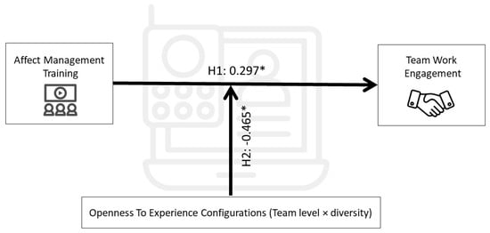 Prior research has considered a similar framework when studying engagement and personality [56]. Despite this, there has been debate about the way personality configurations influence team outcomes [57,58]. In this context, personality configurations have been studied through different operationalizations. For example, mean values of individual scores (i.e., team magnitude or level [59]) have been linked to team performance and results ([52,60]. However, other studies have also examined personality in terms of SD values (i.e., diversity), linking it to team outcomes such as performance or interaction styles [61]. Thus, the myriad of results [58,62,63] may be due to the different measurement approaches to personality composition and the complexity of considering various types of configurations existing in a team [58], so that specific compositional effects may not be properly understood [64,65]. The inconsistent results found to date are worrisome because they imply a lack of proper understanding of composition effects in virtual teams, which may lead to inadequate selection procedures and problems for virtual team’ sustainability, especially if these teams have faultlines. Thus, there is a need for research that creates knowledge consensus [66] about how different personality configurations influence team results, particularly in virtual teams, where it is still an emerging topic [67]. Consequently, based on the contingent configuration approach [54], we propose that for a team to successfully increase its TWE through affect management, it must have high levels of openness to experience but also low diversity in this trait. In other words, OEC will moderate the effects of the training on TWE by combining team-level openness and diversity in a complex configuration. In doing so, to the best of our knowledge, this study is the first to combine OEC to evaluate their interactive effects on affect management training.
