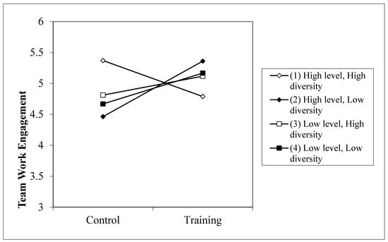 Following Aiken and West [117], we interpreted this significant three-way interaction effect using the simple slope test, in order to find out whether the effect of the training on TWE was significant at specific high and low values (1 SD below and above the mean) of the moderating variables. As line 2 of the plot in Figure 4 shows, the effects of the training were positive and significant when there was high openness to experience at the team level and low diversity (t = 3.27, p < 0.01), whereas the rest of the combinations were not significant. Specifically, the configurations of high level of openness to experience and diversity (1) (t = −1.5, p = 0.13) and low levels of openness with either high (3) (t = 1.1, p = 0.267) or low diversity (4) (t = 1.67, p = 0.103) did not produce significant results. Thus, we can conclude that the predicted pattern (high levels of openness to experience and low diversity) is the one that best helps to enhance the effects of the affect management training on TWE.