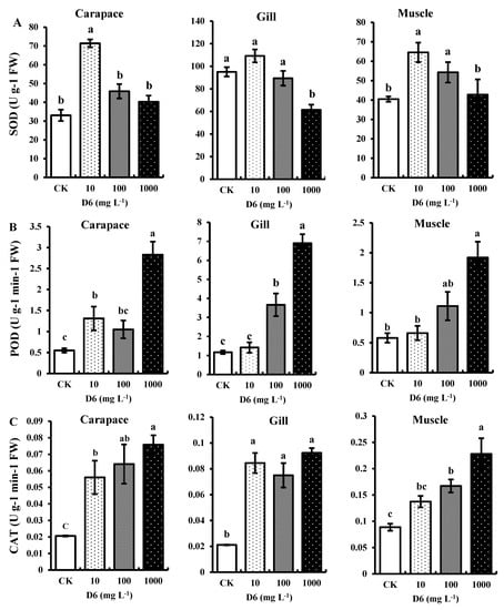 Estimated antioxidant enzymes: (A) superoxide dismutase (SOD), (B) peroxidase (POD), and (C) catalase (CAT) activities in the carapace, gill, and muscle tissue of crayfish under D6 (mg L−1) treatment. Bars denote SD for the means (n = 3). Different small letters show significant differences among the treatments at p < 0.05.