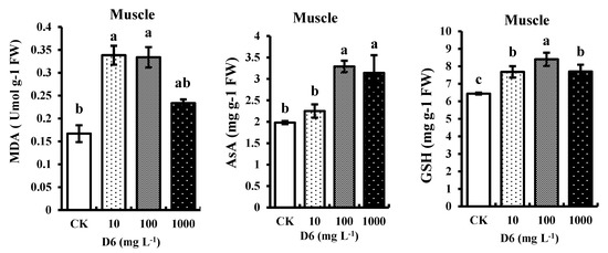 Compared with CK, the nonenzymatic AsA and GSH contents were significantly (p < 0.05) improved with the increase of D6 concentrations, as presented in Figure 2. AsA and GSH contents were increased by 19–31% and 21–28% in muscle tissue. AsA and GSH contents at 100 mg L−1 D6 exposure were a maximum of 3.29-fold and 8.4-fold higher than the control.