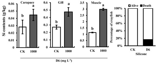 Estimated Si contents in the different organs (carapace, gill, and muscle) of crayfish and the percentage (%) of dead and alive crayfish treated with D6.