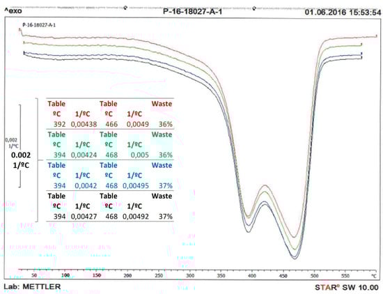 In order to determine the NR content, thermogravimetric tests will be used in concordance with UNE 80602, where the temperatures of decomposition and the mass reduction of NR, and SBR are determined. Samples between 15 to 20 mg of weight, subjected to a temperature ramp of 30 to 600 °C with a rising rate that starts at 20 °C/min in an atmosphere of dry nitrogen supplied with a flow rate of 80 mL/min. Thus, it is possible to obtain the characteristics of the temperature dependence of the sample mass at a constant heating rate []. Finally, weight loss versus time allows determining two points: