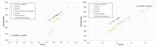 The laboratory has used one calibration line made with pattern samples and known NBR/(NR + SBR) ratios vulcanized solely for these analyses. With the calibration line, for both light and heavy vehicles, the surveys were analyzed to find out the most and least favourable sample, and the calibration line was also used to find out the evolution of the surveys. In the following graphs, we considered supplier 1 from survey 1 but supplier 2 has been discarded. Figure 5 shows the result of the different surveys and tests carried out in this study.