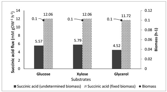 Constraint-based simulations were carried out for the strain under the specified conditions—glucose uptake rate set to the closest to that observed experimentally, anaerobic conditions—and the results show that, on glucose, the optimal growth rate for this strain is 0.3 h−1. Throughout predictive simulations along the target reaction (biomass), there are several metabolites which are produced such as succinic acid, acetic acid, lactic acid and formic acid, the concentrations of which are determined in mM gDW−1 h−1. Using flux balance analysis and theoretical maximum predictions, we can see the succinic acid production differences between undetermined and fixed biomass (undetermined vs. fixed). In the case of each substrate, the predictions show a doubled succinic acid flux. Glucose and xylose reach 5.57 and 5.79 mM gDW−1 h−1 fluxes, respectively, compared with glycerol, which presents a lower flux with a 4.52 mM gDW−1 h−1 value in normal conditions (undetermined biomass flux). By setting the constraint on biomass to 0.1 value, we can see an increased succinic acid flux in each case. If pathways to biomass creation are limited, carbon fluxes are headed to organic acids that can be produced. Results are presented in Figure 1.