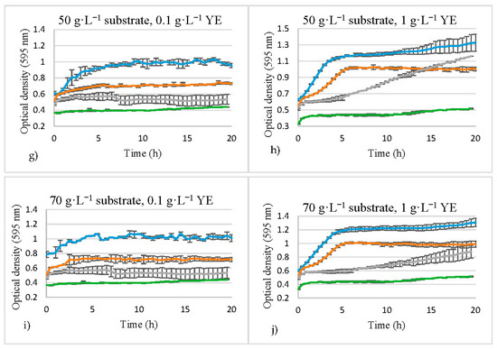 Effect of initial substrate and yeast extract (YE) concentration on B. succiniciproducens population growth dynamics in microplate experiments. Legend: orange line—glucose, blue line—xylose, grey line—glycerol, green line—control (without added bacteria). (a,c,e,g,i) shows the optical density over time with concentrations 5, 15, 30, 50, 70 g·L−1 respectively on glucose, glycerol and xylose with supplemented 0.1 g·L−1 YE. Subfigures (b,d,f,h,j) presents the optical density over time with concentrations 5, 15, 30, 50, 70 g·L−1 respectively on glucose, glycerol and xylose with supplemented 1 g·L−1 YE.