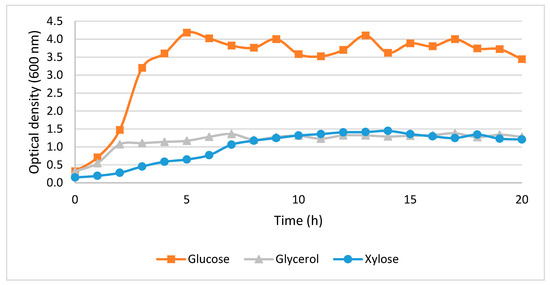 Significant differences were observed in the bioreactor setting between glucose and the other substrates, mainly faster growth and short adaptation for glucose and the reached optical density being four times higher compared to xylose or glycerol. Glycerol and xylose consumption was slower, and the highest optical density during fermentation was only 1.2 for both substrates after 20 h of fermentation. Although the two substrates might present the same effect on the culture in terms of biomass production at the end of the fermentation period, there is a significant difference in the adaptation period for the two cultures: the culture grown on xylose needed a three-times longer adaptation period compared to the glycerol-fed cultures until reaching the plateau phase of growth. A higher reduction grade in the case of glycerol, which can cause significant redox imbalance in the cell, can result in reduced growth rate in the case of this substrate, which could explain the lower biomass production through fermentation [47]. In the case of xylose, however, we observed a different behavior of our strain in the bioreactor setting compared to our small-volume experiments, the growth profile in the bioreactor culture being closer to the less assimilated glycerol-fed culture. One possible explanation could be the CO2 atmosphere with reduced O2 inlet, which could limit biomass formation by inhibition of NAD+ regeneration via the oxygen-dependent NADH oxidase step [48].