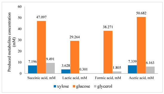According to our studies conducted in the bioreactor set up under CO2 atmosphere, glucose was the most suitable substrate. The metabolite profile of fermentation showed the presence of metabolic by-products (acetic acid, formic acid and lactic acid) and the target product, succinic acid, was formed. Our findings suggest that lignocellulosic feedstocks (containing glucose, xylose) can be utilized as industrial substrates, and would be a cost efficient solution for the production of high added-value components, such as succinic acid [49]. The highest succinic acid concentration, 5.55 g·L−1 (47.097 mM), reached is comparable to those presented in the literature: 4.6–6.4 g·L−1 with glycerol [35], 26 g·L−1 using xylose [36], and 30 g·L−1 on lignocellulosic hydrolysate, used as main carbon sources [50].