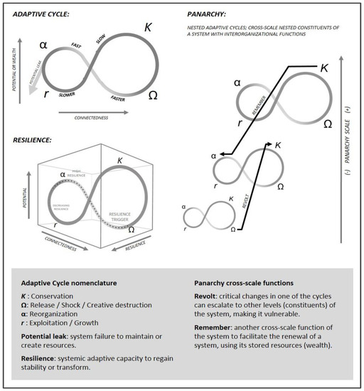 In engaging the work of evolutionary ecologists, resilience mechanisms can be better explained under the adaptive-cycle and panarchy models: a non-linear heuristic framework used to describe the evolutionary behavior of diverse entities and groups within natural or social systems, recognizing distinct stages of transformative behavior [13,45]. Figure 1 synthesizes the main notions of the adaptive cycle, panarchy, and resilience mechanism altogether.