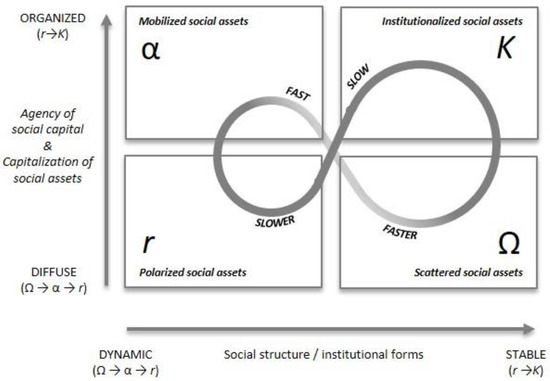 When an adaptive cycle is subjected to potential leaks in its α-to-r course, the regular pathway of resilience as a mechanism to regain stability is altered, with iterative transformations that may generate less organized conditions, hampering future conservation stages (K2), hence affecting the system’s capacity to generate and store resources or useful assets and capital needed to tolerate future destabilizing events. Thus, adaptive cycles may represent regular and contradictory patterns of behavior, of groups or individuals within a system—these being flexible, efficient, constitutive, transformational, connected, adaptable, and so on [9,21].