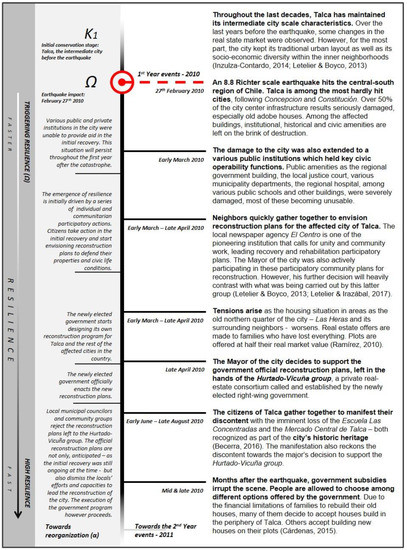 The aftermath of the 27-F earthquake in Talca until early 2012, as observed in the timeline-analysis model, would show resilience in terms of recognizing a recovery and ongoing reconstruction process. However, the terms in which the reconstruction program was carried out revealed inter-organizational conflicts between local institutional efforts and government plans to emphasize regeneration and revitalization programs [69]. Additionally, there was a lack of attention to the territorial dimensions of community cohesiveness, memory, and identity, causing the loss of capitalization of social assets in the reconstruction process [73].