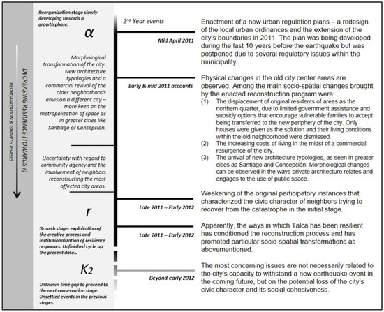 In summary, the phase of reconstruction until the end of the second year (from α to r in Figure 4) showed dissimilar stages of progress, in terms of rehabilitating the livelihood of areas such as the historic neighborhoods and the increasing residential sprawl found in the new peripheries of Talca [69].