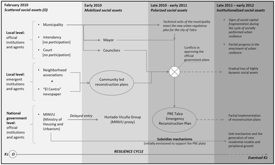 Further on, the polarization of social assets would be characterized by conflicts in the approval of the official reconstruction plan, losing the opportunity to incorporate this emergent collective progress. This gradual loss of collective community participation and the partial implementation of reconstruction strategies revealed signs of fragmented social assets and capital in the late stages of the social dimension of urban resilience (early 2012, in Figure 5), also constituting a loss of opportunities to innovate governance and/or enhance the role of public institutions with regard to resilience management [46]. All in all, patterns of a proper performance of urban resilience were effectively present in the observed social dimension, yet these were apparently hampered by institutional inter-organizational conflicts. Apparently, the defragmented municipality plus other key institutional agents such as the MINVU were seemingly problematic in these regards, due to their obstinacy and lack of attention to the communitarian process [65,66].