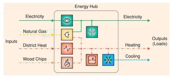 As seen in Figure 1, the energy hub consists of input energy vectors, which can either be stored or converted (for example, heat energy from district heat is converted to a cooling energy output via an electric chiller) and released as output energy of a different form. In general, energy hubs comprise of three main elements [27]: direct connections, converters, and storage devices.