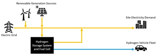 In Figure 2, the yellow lines represent electricity, which can be sourced from either the electric grid, renewable generation sources, the fuel cell, or all at the same time. The blue line represents hydrogen, which is used to fuel the fleet of hydrogen fuelled vehicles.