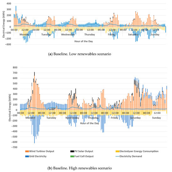 These scenarios demonstrate the optimal operation of the test system during a week for both on-site low and high renewable energy generation. Figure 6 shows the optimisation results for the electricity system in these scenarios.