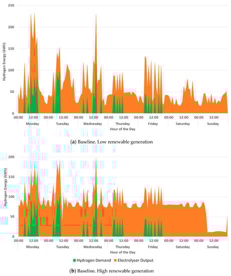 It is relevant to note that on-site hydrogen storage information was not available. Therefore, the analysis of hydrogen storage and its impact is presented and discussed in Section 3.2. Observing the differences in Figure 5a,b, it is evident that the higher and more consistent electrolyser output levels are attributed to the higher renewable energy generation. The electricity and hydrogen demand profile shown in Figure 4a,b, as discussed in Section 2.2.2, will be the same in subsequent studies.