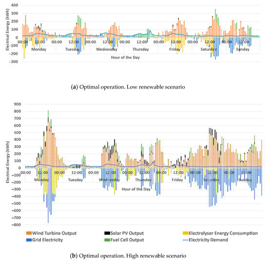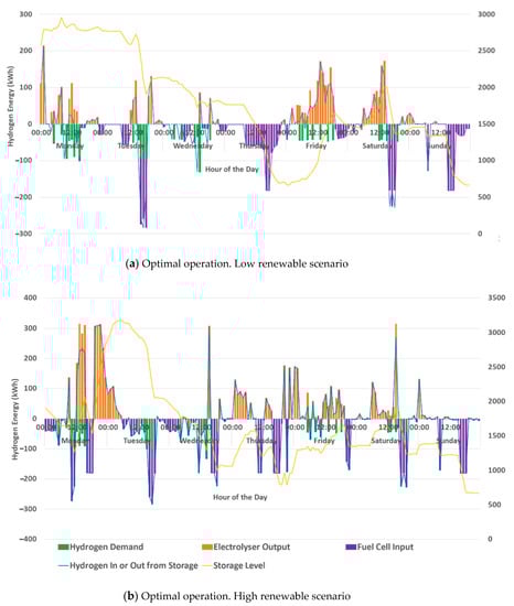 Figure 7a,b show the optimisation results for the hydrogen system in the optimal operation scenarios.