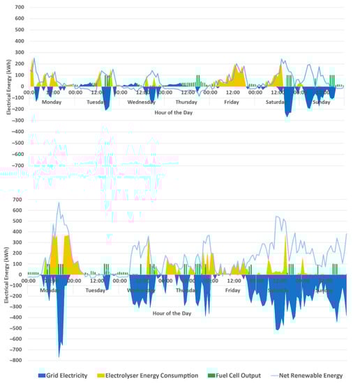 Looking at Figure 6a,b, when the renewable power outputs are high, the electrolyser load increases at the same time (see Figure 6a, Friday, between the hours of 4 am and 6 pm). This is because the system converts excess renewable generation into hydrogen for storage. The fuel cell output follows high electricity import/export prices (16:00–19:00 h) to reduce costs and increase electricity export revenues, and it also compensates for periods with lower renewable energy generation on-site. This is seen on Thursday in Figure 6a, as there is continuous fuel cell utilisation between the hours of 08:00 to 22:00. Having foresight of a low renewable energy generation period triggers the fuel cell to consume stored hydrogen for electricity load balancing purposes so as to avoid importing electricity from the grid.