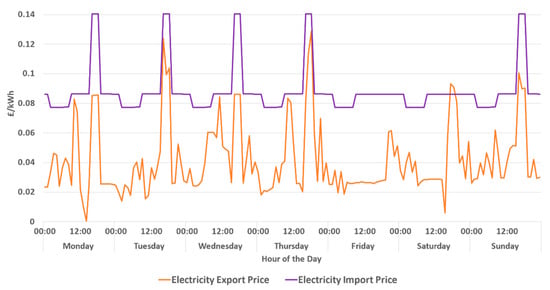 Electricity export and import price profiles are also kept the same for the same reason and reflect typical prices in the UK. Each scenario is run for two weeks within the model at hourly time granularity. A period of one week comprising the optimisation results of the second week has been extracted to avoid start-stop effects of the optimisation in the first week. This was done to prevent bias in the data analysis.