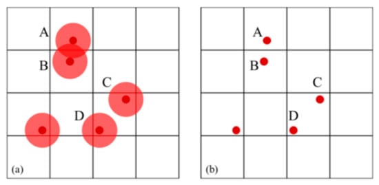 To obtain the natural occurrence records for A. arguta, we checked the Chinese Virtual Herbarium (CVH, http://www.cvh.ac.cn/), the National Specimen Information Infrastructure (NSII, http://nsii.org.cn/) and the Global Biodiversity Information Facility (GBIF, https://www.gbif.org/). When occurrence records lacked exact geo-coordinates, we used Google Earth to determine the latitude and longitude, and delete duplicate and ambiguous records. For redundant data point elimination, there are two methods. One is to use a buffer function; only one point is retained in the buffer. Second, ENMTools [24] is used to automatically analyze the occurrence data and remove the redundant data in the same raster. In this study, we conducted the above two methods separately. In method 1, a buffer zone radius of 1.25 km was used; points A or B were deleted, and points C and D were retained. However, using method 2, we found that points A and B were not in the same raster (2.5 × 2.5 km) and should be retained in their entirety, while one of C and D should be deleted. After a comprehensive comparison, this study used ENMTools for redundant data point removal (Figure 1). Finally, a total of 93 occurrence records of A. arguta were obtained for constructing the models (Figure 2).