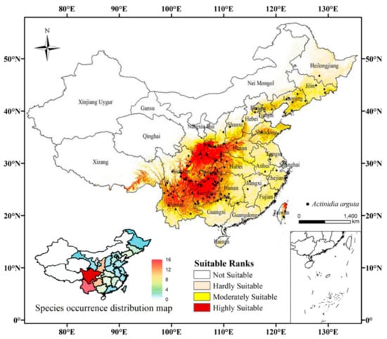 Distribution records and current suitable climatic distribution of A. arguta in China.